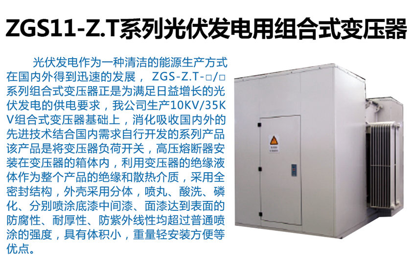 ZGS-Z.T-□/□系列組合式變壓器是消化吸收內外的先進技術結合內需求自行開發的系列產品,該產品是將變壓器,負荷開關,高壓熔斷器安裝在變壓器的箱體內,利用變壓器的絕緣液體作為整個產品的絕緣和散熱介質,采用全密封結構,外殼采用分體,噴丸、酸洗、磷化、分別噴涂底漆、中間漆、面漆達到表面的防腐性、耐厚性、防紫外線性均超過普通噴涂的強度,具有體積小,重量輕、安裝方便等優點。